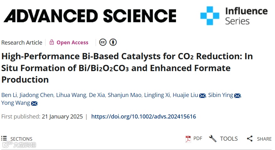 近日,来自浙江大学的王勇教授团队在国际知名期刊Advanced Functional Materials上发表题为“High-Performance Bi-Based Catalysts for CO2 Reduction: In Situ Formation of Bi/Bi2O2CO3and Enhanced Formate Production”的文章。该文章中提出了一种开发新型Bi-单宁酸(Bi-TA)电催化剂的设计思路。该Bi-TA电催化剂在 CO2还原反应过程中发生原位重构,转变为 Bi/Bi2O2CO3相,这一重构相有效增强了催化剂制甲酸的法拉第效率,为后续高性能电催化CO2RR催化剂提供了理论指导。
