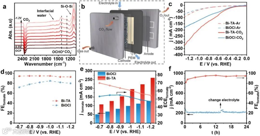 实现生产工业化是电催化CO2反应的长期目标,该目标需要催化剂具有高催化活性和大电流密度,稳定性以及体系的低能耗,是实现商业规模应用的关键。我们在1M KOH的流动池中测试了Bi-TA的CO2RR催化活性。LSV曲线表明电流密度显著改善,在−1.0 V的电压下超过200 mA cm-2的电流密度。对产物进行分析,在−0.7 V至−1.2 V的电压范围内,液相还原产物只有甲酸。FE HCOOH保持在92%以上。能量转换效率(ECE)是实际应用CO2RR的一个关键参数,计算从输入电能储存在目标产品中的化学能的百分比。当电流密度进一步增加至250 mA cm−2时,Bi-TA甲酸盐的ECE均超过50%。这意味着在我们的系统中,在较宽的工作电位窗口内大部分电能用于生成甲酸盐。从技术经济角度分析,该体系符合实际应用要求。另外催化剂在−1.0 V下工作24 h后电流密度保持在200 mA cm−2不变。上述结果表明,Bi-TA具有良好的催化活性和稳定性,具有一定的工业应用前景。