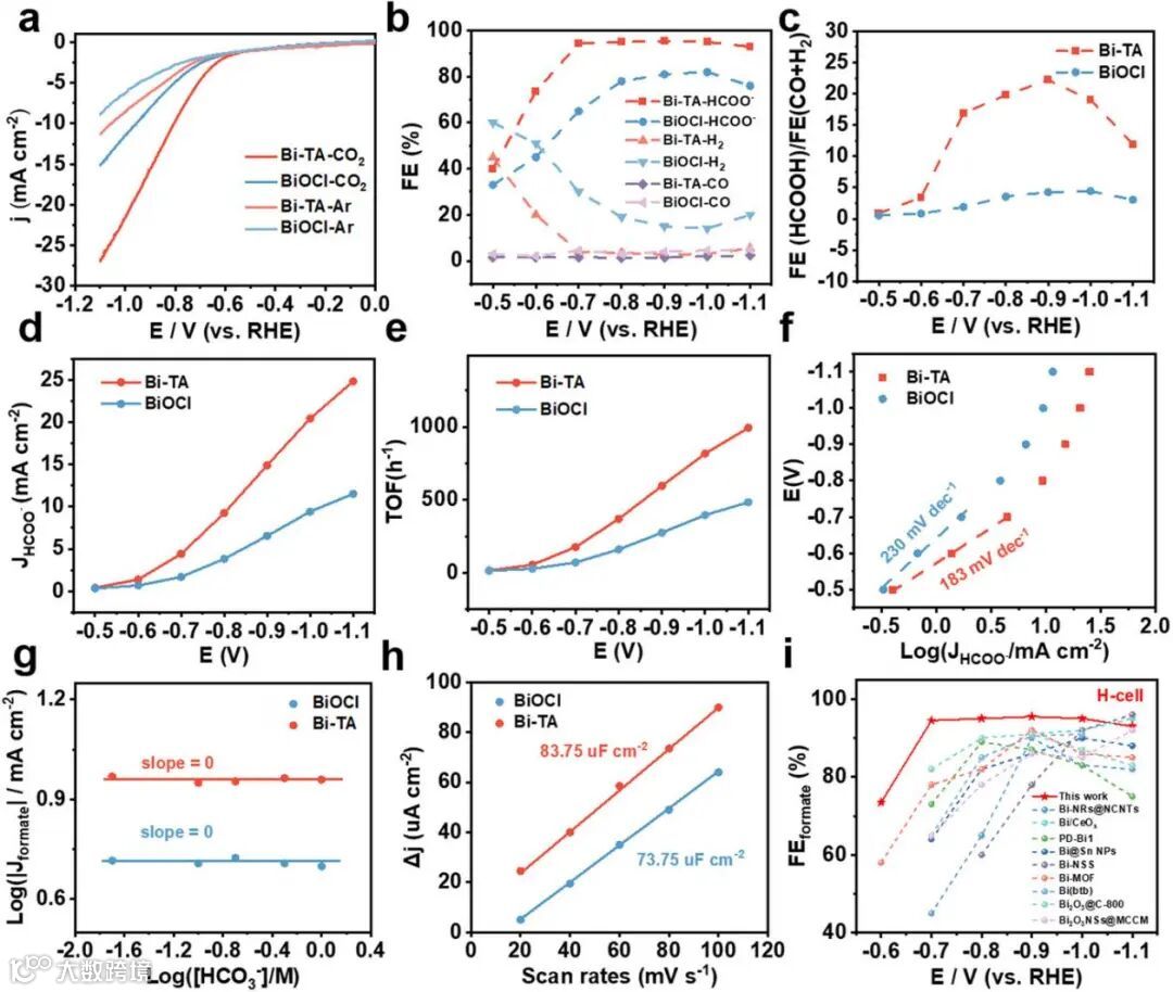 在H型电解池中对制备得到的系列电催化剂的CO2RR性能进行了测试。测试过程中使用CO2饱和的0.5 M KHCO3作为电解质溶液。LSV曲线显示,在CO2饱和电解质中,催化剂的阴极电流相比于Ar气氛中显著增加,表明发生了CO2RR。CO2RR的产物分布通过-0.5至-1.1 V的恒定电位电解进行量化,分别使用气相色谱和1H NMR对气体和液体产物进行定性及定量分析。结果显示Bi-TA催化剂相较于BiOCl表现出更优的CO2RR性能。甲酸被确定为CO2还原过程中唯一的液体产物。在-0.9 V时,Bi-TA催化剂的FEHCOOH可达96%,且在-0.7到-1.1 V的宽电位范围内保持超过90%的FEHCOOH,远远高于BiOCl。此外,Bi-TA的FEHCOOH/FECO+H2的峰值超过了20,约为BiOCl峰值的4倍,这一数据能够比较直观地说明Bi-TA相对于BiOCl有着对CO2RR制甲酸更优的选择性,进一步说明了Bi-TA催化剂设计的合理性。随后通过比较生成特定产物的部分电流密度,可以更直观地展示催化剂在CO2RR中生成转化该产物能力。通过计算得知Bi-TA在-1.1 V下的甲酸部分电流密度为25 mA cm-2,显著高于BiOCl的12 mA cm-2。另外转换频率是衡量CO2RR活性的重要指标。TOF的大小表明了在特定的电化学条件下,催化剂单位时间内促使CO2发生电还原生成特定产物的能力。TOF分析显示,Bi-TA在-1.1 V下的最大TOF值约为1000 h-1,接近于BiOCl的两倍,这进一步说明在Bi-TA上进行CO2还原反应产甲酸更为有利。以上结果表明,相较于BiOCl,Bi-TA具有更高的选择性和活性,且优于大多数已报道的CO2转化为甲酸的电催化剂。