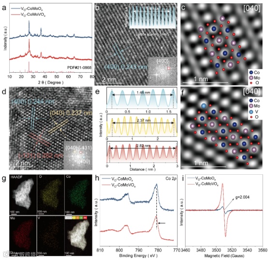 图1. a) VO-CoMoOx 和 VO-CoMoVOx 的 XRD 图。b-c) VO-CoMoOx的高分辨率 TEM 图像。d-f) VO-CoMoVOx 的高分辨率 TEM 图像;g) VO-CoMoVOx 催化剂的 HAADF-STEM 和相应的元素图谱图像;h) Co 2p 的 XPS 光谱;i) VO-CoMoOx 和 VO-CoMoVOx 的 EPR 光谱。