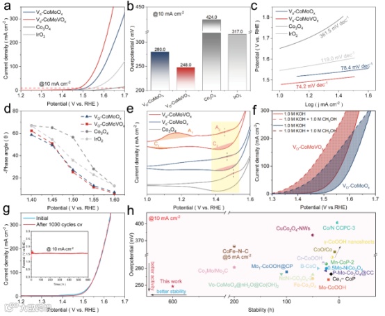 图 3. a) Co3O4、IrO2、VO-CoMoOx 和 VO-CoMoVOx 在 1.0 M KOH 溶液中的 LSV 曲线。b) 根据 LSV 曲线比较电流密度为 10 mA cm-2 时的过电位。e) VO-CoMoOx 和 VO-CoMoVOx 在 1.0 M KOH 溶液中测得的 CV。f) VO-CoMoOx 和 VO-CoMoVOx 在 1.0 M KOH 溶液和 1.0 M 甲醇中的 LSV 曲线:h) VO-CoMoVOx 与最近报道的 Co 基 OER 电催化剂在碱性电解质中 10 mA cm-2 电流密度下的过电位和稳定性比较。