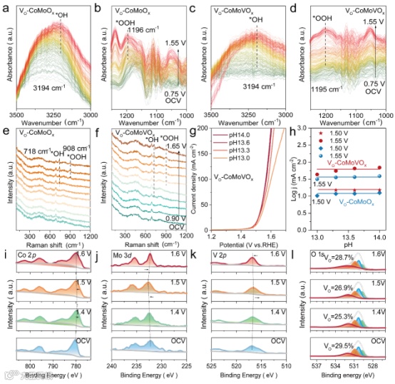 图 4. a-d) 1.0 M KOH 中 VO-CoMoOx 和 VO-CoMoVOx 上 OER 的操作性 ATR-SEIRAS 光谱。g-h) VO-CoMoOx 和 VO-CoMoVOx 在 1.50 V 和 1.55 V 下不同 pH 值下 VO-CoMoOx 和 VO-CoMoVOx 催化性能的 pH 依赖性以及相应的 log(j)。1.0 M KOH 中 VO-CoMoVOx 上 (i) Co 2p、(j) Mo 3d、(k) V 2p 和 (l) O 1s 的原位 XPS 光谱。