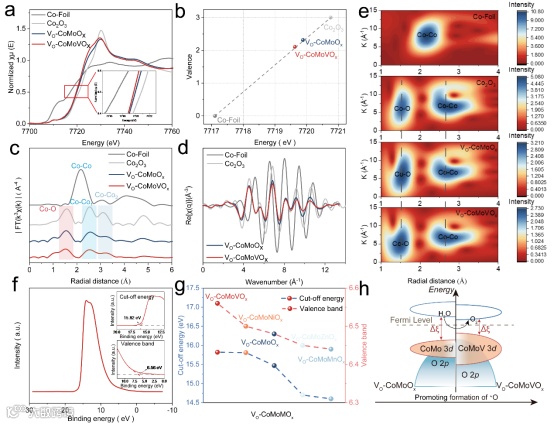 图 2:VO-CoMoMOx 的电子结构特征。a) Co 箔、Co2O3、VO-CoMoOx 和 VO-CoMoVOx 在 Co K 边的 XANES 光谱。c) Co 箔、Co2O3、VO-CoMoOx 和 VO-CoMoVOx 的 FT-EXAFS。e) Co 箔、Co2O3、VO-CoMoOx 和 VO-CoMoVOx 的 Co K 边 EXAFS 数据的小波变换。f) VO-CoMoVOx 的 UPS 光谱,插入:截止能谱和价带光谱拟合。g) VO-CoMoMOx 的相应截止能值和价带值(d 带中心的趋势与这些值大小的趋势一致)。h) V掺杂和氧空位对 d 带中心影响的示意图。