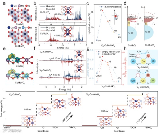 图 5 a) VO-CoMoOx 和 VO-CoMoVOx 的几何结构。b) VO-CoMoOx 和 VO-CoMoVOx 的 d 轨道和 p 轨道状态密度 (DOS)。d) VO-CoMoOx 和 VO-CoMoVOx 中 M-d 和 O-p 轨道的能带示意图。e) VO-CoMoOx 和 VO-CoMoVOx 中 Co 原子的电荷密度差:黄色区域表示电子积聚,蓝色青色区域表示电子耗尽。f) VO-CoMoOx 和 VO-CoMoVOx 的 d 轨道和 p 轨道状态密度(DOS)。g) VO-CoMoMOx 样品中 M-d 轨道和 Co-d 带中心空率的变化趋势。h) VO-CoMoOx 和 VO-CoMoVOx 中电子扩散和外电路反馈示意图。i) VO-CoMoOx 和 VO-CoMoVOx 在 1.23 V 与可逆氢电极(RHE)的偏置电位下的自由能图。