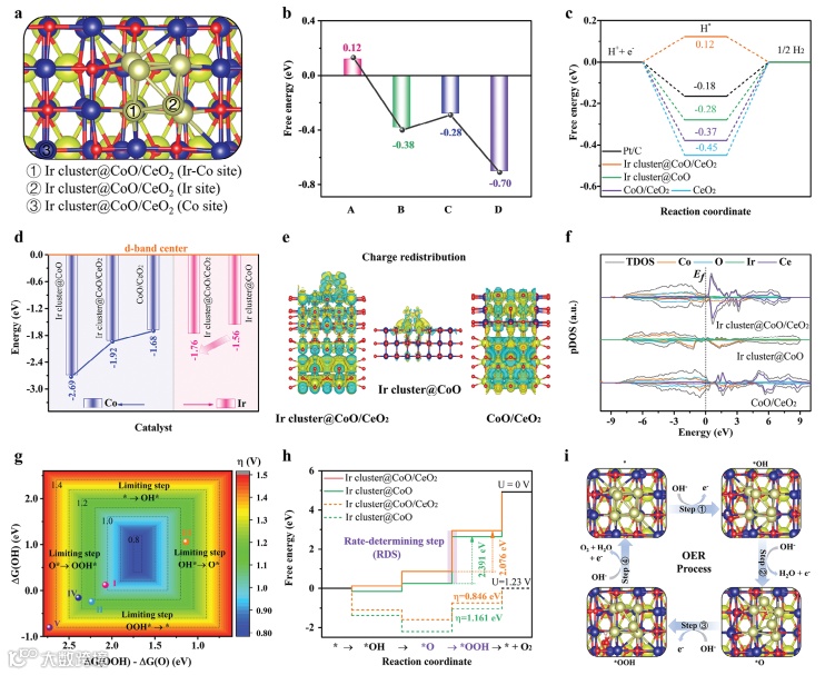 在Ir cluster@CoO/CeO2中,CeO2核作为电子供体稳定催化剂界面的电子环境,而CoO壳层通过强电子相互作用有效地锚定亚纳米Ir簇,并通过Ir─Co键协同催化反应。DFT计算表明,定向电子转移(沿着从Ce到Co再到Ir的路径)为表面Ir团簇创造了一个富电子环境。重构的界面电子环境在Ir位点(HER)和Ir-Co位点(OER)提供了优化的中间体吸附/解吸能,从而同时加快了HER/OER动力学。