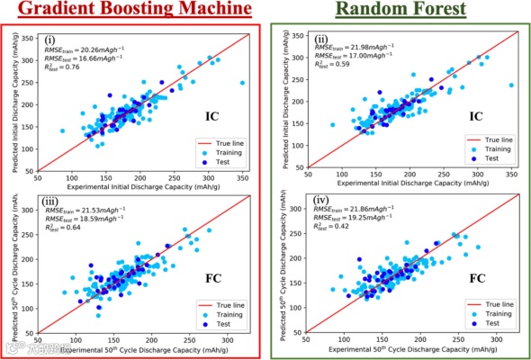 图3. GB 和 RF 模型对掺杂 NCM 正极系统的充电(IC)和放电(FC)容量预测结果。