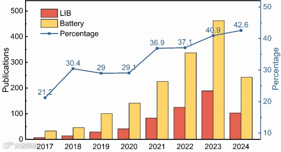 图1. 2017 - 2024 年,每年有关电池材料和 ML 以及锂离子电池材料和 ML 主题的论文发表数,以及锂离子电池相关论文占电池论文总数的比例。数据来源于 Web of Science,截止日期为 2024 年 7 月 23 日。