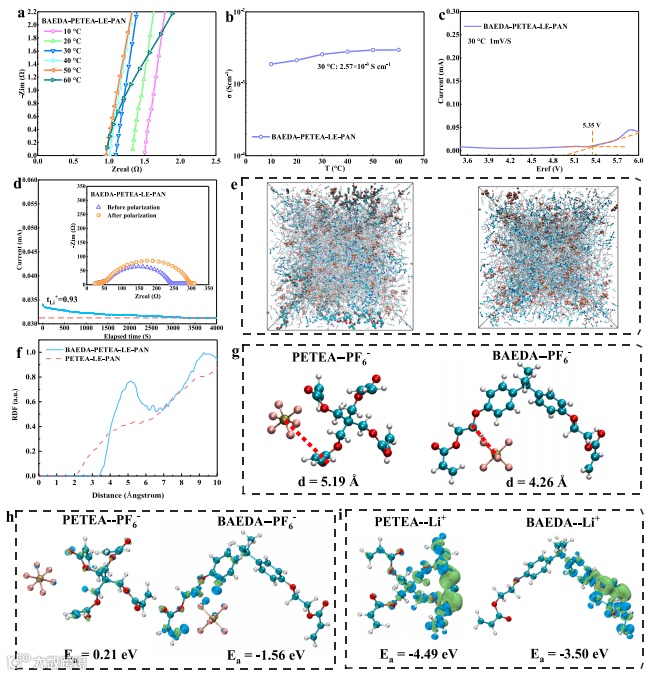 图2 BAEDA-PETEA-LE-PAN电解质的基本电化学性能及高锂离子迁移数机理研究