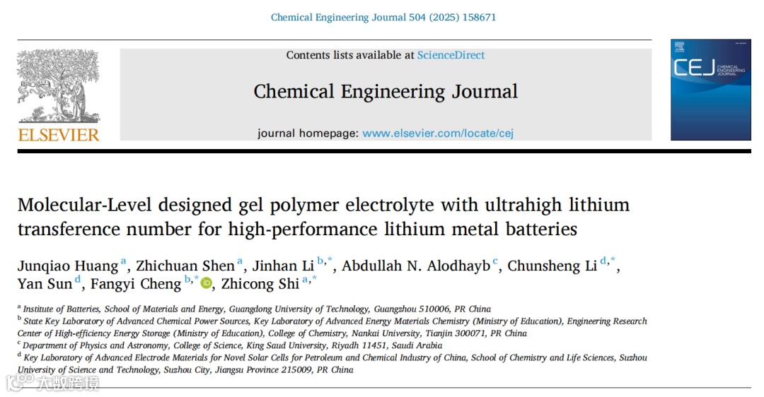 Molecular-Level designed gel polymer electrolyte with ultrahigh lithium transference number for high-performance lithium metal batteries.