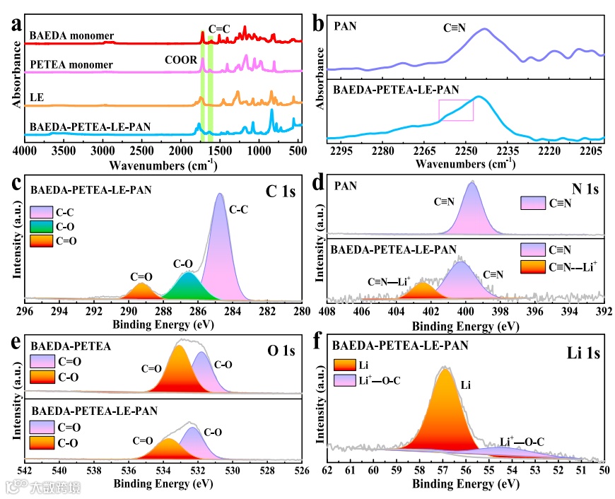 采用FTIR和XPS技术对锂离子传输机理进行了研究。对比PAN谱线,在BAEDA-PETEA-LE-PAN的光谱中出现了一个不明显的肩峰,表明Li+与PAN的腈基之间存在配位作用(图1b)。对PAN、BAEDA-PETEA和BAEDA-PETEA-LE-PAN进行XPS分析(图1c-f)。BE值的降低通常表明原子接受电子,而增加的值反映了原子对其周围环境的电子贡献。与BAEDA-PETEA谱线相比,BAEDA-PETEA-LE-PAN中的C=O和C-O峰已经转移到532.32和533.69 eV,证实了Li+与C-O之间形成了相互作用。此外,BAEDA-PETEA-LE-PAN的N 1 s谱在400.84eV处有一个峰,这说明Li+与PAN的腈基之间存在配位作用。这一现象与前文的FTIR分析一同为C≡N---Li+偶极离子对的存在提供了证据。