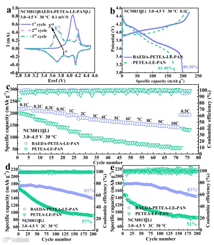 图3 配备BAEDA-PETEA-LE-PAN电解质的高镍锂电池性能-