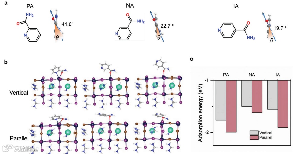 图1. 烟酰胺及其衍生物的空间构型及与宽带隙钙钛矿之间的相互作用。