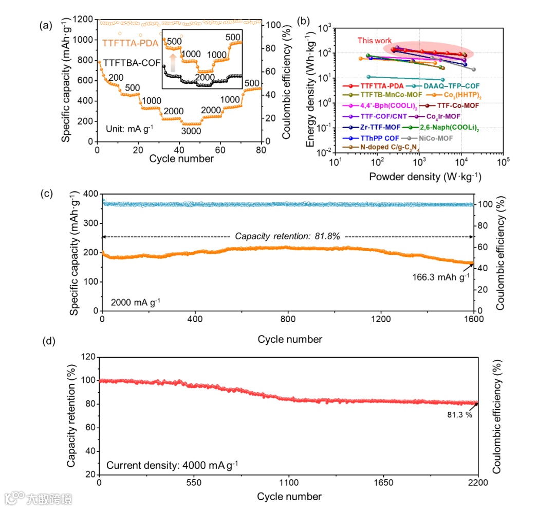 图4. TTFTTA-PDA COF在半电池(a, c)以及全电池(b, d)中表现出优异的性能。