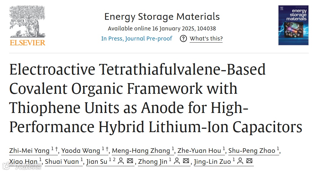 近日,来自南京大学的左景林教授,金钟教授,袁帅教授以及南京理工大学的苏剑教授合作,在国际知名期刊Energy Storage Materials 上发表题为 “Electroactive Tetrathiafulvalene-Based Covalent Organic Framework with Thiophene Units as Anode for High-Performance Hybrid Lithium-Ion Capacitors” 的文章。