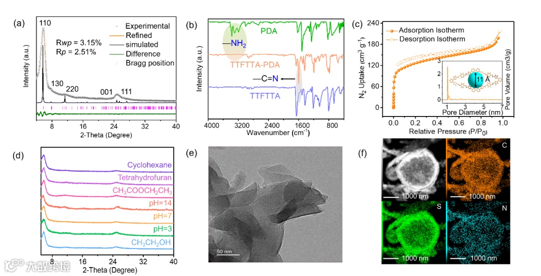 图3. TTFTTA-PDA COF基本结构和性质表征。
