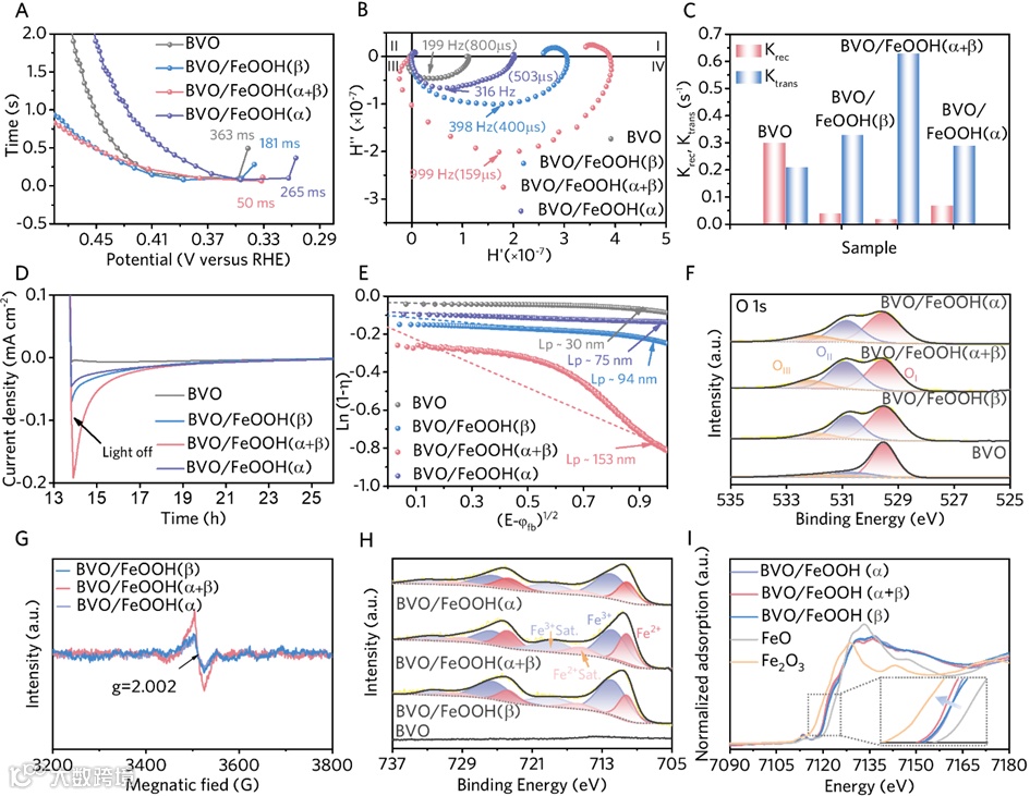 图4. 不同BVO/FeOOH薄膜(A) OCP推导的n, (B) IMPS的Nyquist图,(C) Ktrans和Krec速率常数,(D)在0.4 VRHE下测得的阴极光电流曲线的延迟,(E)利用Gärtner模型推断Lp的ln(1 - η)与(E - φfb)1/2的关系图和(F) O 1s峰的XPS光谱;(G)不同BVO/FeOOH薄膜的EPR谱;(H)不同BVO/FeOOH薄膜Fe 2p峰的XPS光谱;(1) FeO、Fe2O3、BVO/FeOOH(β)、BVO/FeOOH(α+β)和BVO/FeOOH(β)样品的归一化Fe k边XANES光谱。