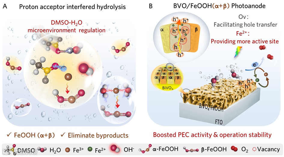 图1. (A)质子受体干预水解过程制备混合相FeOOH助催化剂的示意图;(B) BVO/FeOOH(α+β)光阳极中载流子转移过程和Fe2+循环再生促进薄膜稳定性示意图。