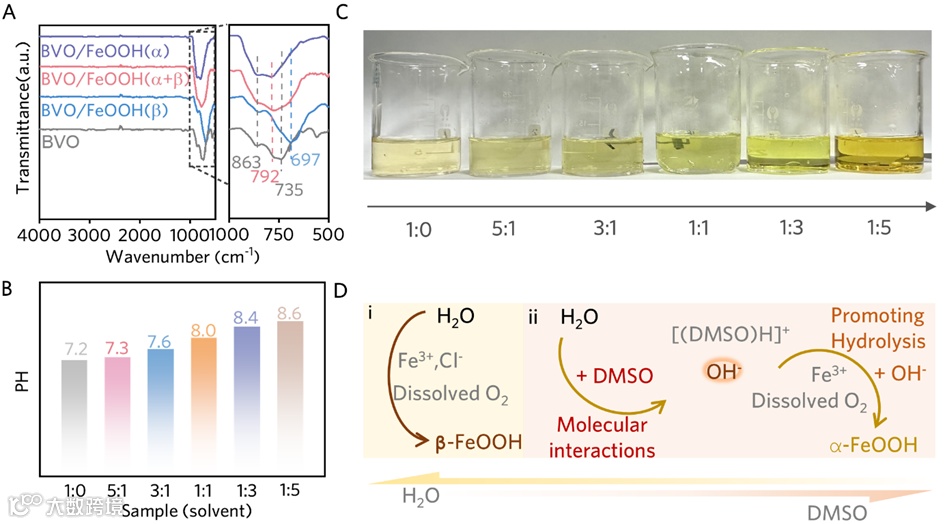 图2. (A)不同BVO/FeOOH薄膜的FTIR光谱;(B)在20℃下,不同水与DMSO比例溶剂的PH值;(C)不同水与DMSO比例的溶剂照片;(D)质子受体引入化学浴沉积中不同相FeOOH的形成过程示意图。