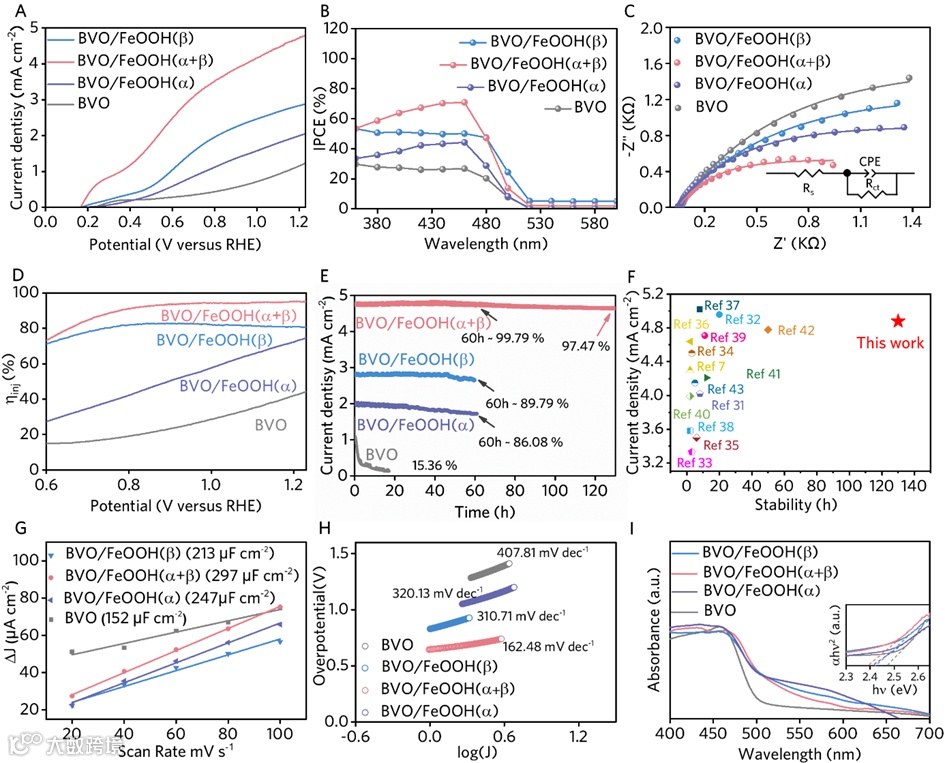 图3. 不同BVO/FeOOH薄膜的(A) J-V曲线,(B) IPCE谱,(C) EIS曲线,(D)表面载流子注入效率和(E)在1.23 VRHE下的长期稳定性;(F) 本工作中BVO/FeOOH(α+β)光阳极与先前报道的FeOOH基BVO光阳极的电流密度和稳定性的比较;不同BVO/FeOOH薄膜的(G)电流密度-扫描速率曲线,(H) Tafel斜率曲线和(I) UV- Vis吸收光谱(插入:由UV/Vis吸收光谱得出的tac图)。