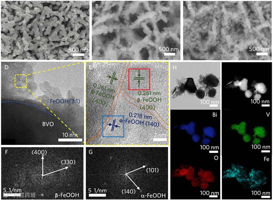 图1. BVO/FeOOH薄膜的形貌表征:(A) BVO, (B) BVO/FeOOH(β)和(C) BVO/FeOOH(α+β)的SEM图像;(D) BVO/FeOOH(α+β)的TEM图像;(E) BVO/FeOOH(α+β)的HRTEM图像((D)中以黄色标记的区域);BVO/FeOOH(α+β)薄膜的(F) α-FeOOH(图(E)中红色标记区域)和(G) β-FeOOH(图(E)中蓝色标记区域)的FFT变换图像;(H) BVO/FeOOH(α+β)的TEM-EDS分析。