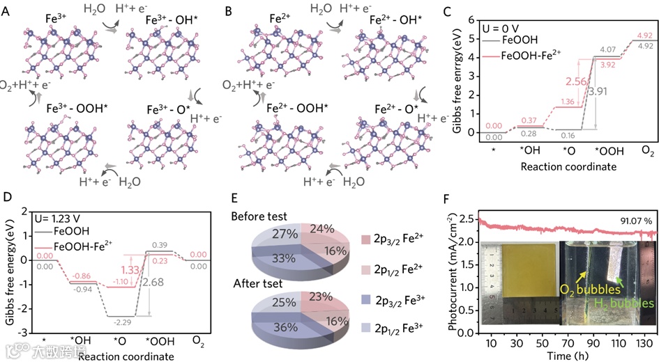 图5. (A) FeOOH和(B) FeOOH-Fe2 +对OER过程OH*、O*和OOH*吸附的优化构型和反应途径(紫球:Fe原子;粉色球:O原子;灰球:氢原子);在(C) 0V和(D) 1.23 V电位下OER各步对应的吉布斯自由能图。(E)稳定性试验前后BVO/FeOOH(α+β)膜Fe 2p的Fe2+和Fe3+饼状图。(F) 大面积BVO光阳极(25 cm-2)的光电化学稳定性 (插入图左:大面积光阳极的图像;右:稳定性测试时PEC反应的图像)。