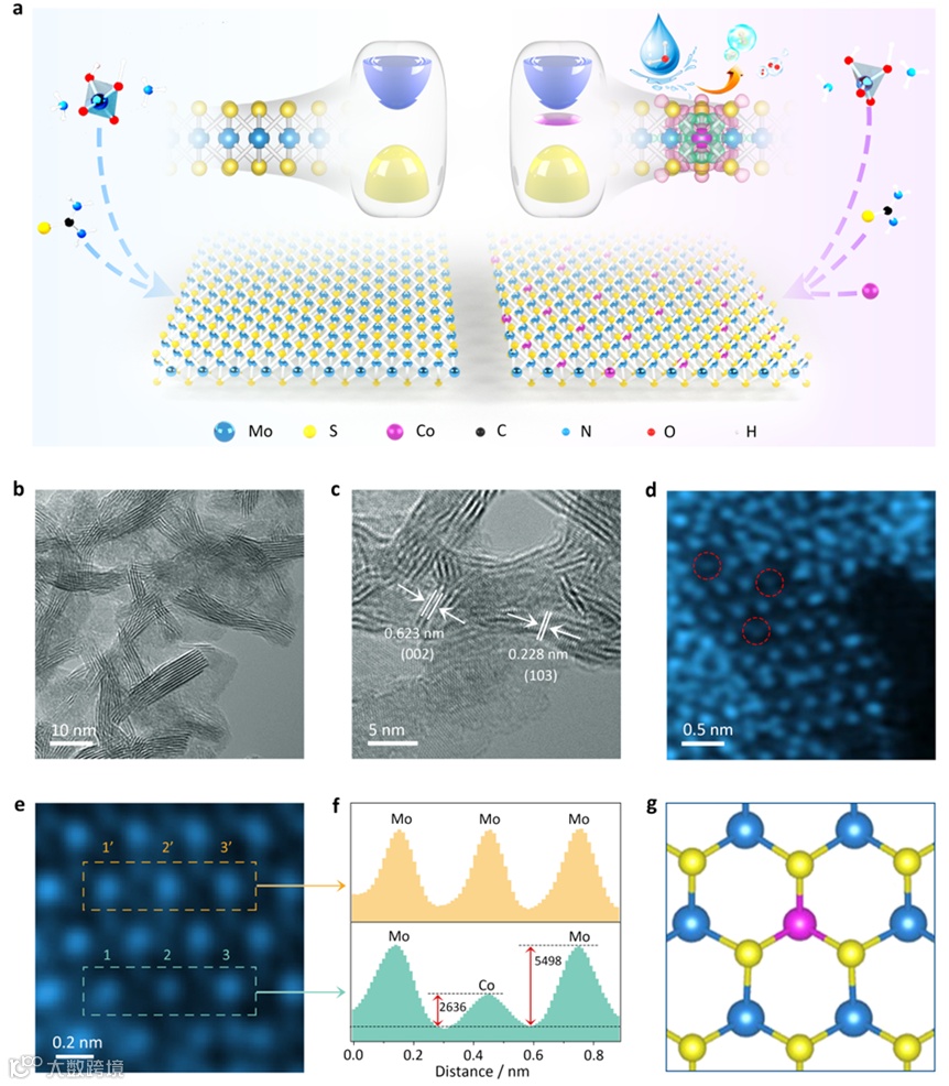 图1. 钴单原子掺杂二硫化钼增强其碱性介质中电解水产氢活性提升示意图。