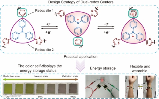 用于高性能柔性电致变色超级电容器的双氧化还原中心聚(噻吩-三苯胺)共轭聚合物