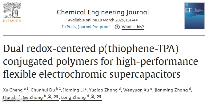 基于此,来自江西科技师范大学的张革副教授与江苏大学的张龙教授合作,在期刊Chemical Engineering Journal上发表题为“Dual redox-centered p(thiophene-TPA) conjugated polymers for high-performance flexible electrochromic supercapacitors”的研究文章。该论文提出“双氧化还原中心”的结构设计策略,用于高性能导电聚合物电极材料的开发及制备,同时,基于该电极材料组装的柔性EC-SCs器件同时具备较大的电容储量(1 A g-1的电流密度下,质量比电容达到37 F g-1)和显的颜色变化(550 nm波长下,透过率达到54%)。该研究有助于导电聚合物电极材料的性能突破,加速器件的实际应用进程。
