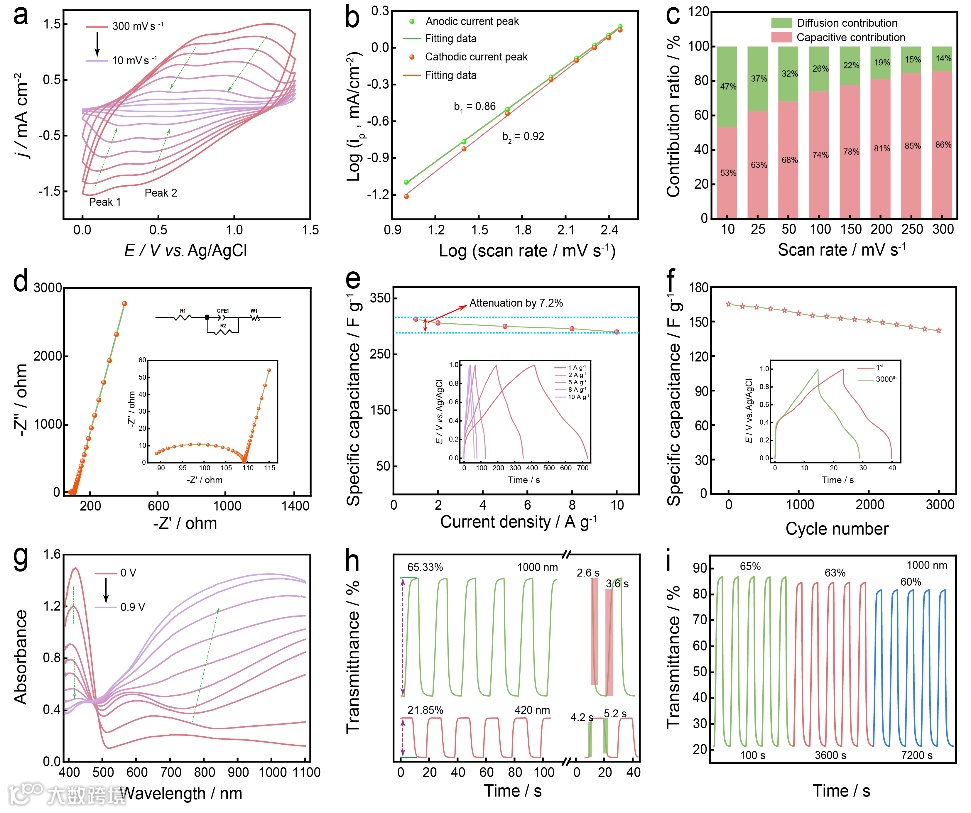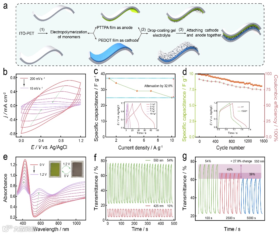 以PTTPA为阳极和PEDOT为阴极组装了非对称EC-SCs器件,该器件表现出良好的电致变色(550 nm处透过率达到54%)和电容能力(1 A g-1下,质量比电容达到37 F g-1),实现了双功能特性的兼顾提升。