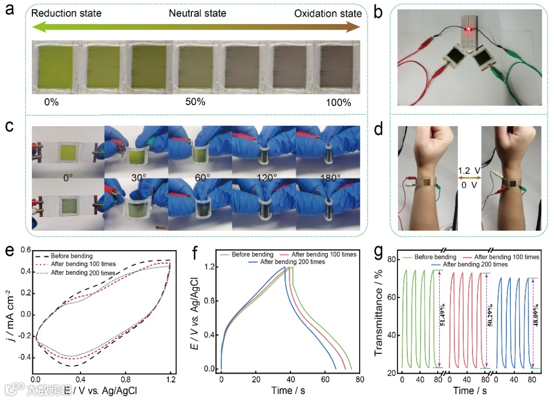 所制备的柔性器件能够为LED小灯泡供能10 s,同时在不同的储能状态下实现不同的颜色反馈。此外,器件还具有良好的抗弯折能力。经过多次的弯折测试,依然有着较好的性能保持率。