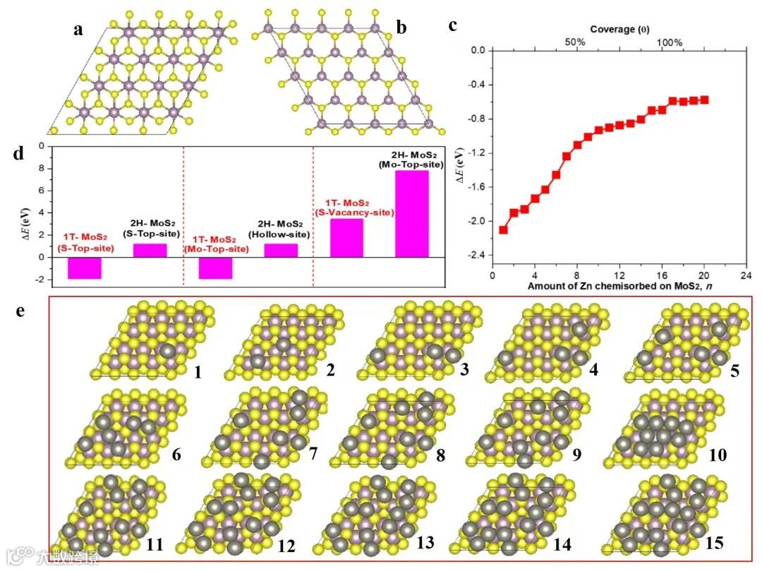 建立结构模型探索Zn2+可能的化学吸附活性位点,随着Zn2+连续加入到1T-MoS2表面,首先自发吸附到模型组的最低能垒,然后是第二低的吸附能垒。最后,当覆盖率θ达到1时,从表面诱导的二维吸附(赝电容型储能机制)转变为三维体相(电池型储能机制)。所以调节锌的吸附势垒可以提高准二维插层型赝电容材料的贡献。