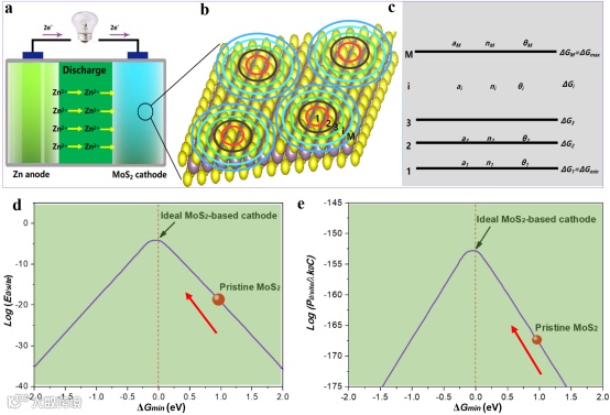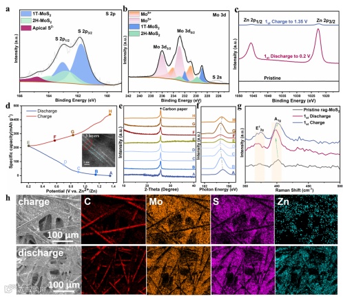 进一步探究rag-MoS2的储锌机理,该团队通过一系列的非原位表征手段对其进行了分析,如图6所示,XPS测试发现,Zn2+的嵌入和脱嵌伴随着Mo价态的相应转变,Mo6+信号明显增强。经氩离子刻蚀的Zn 2p的XPS光谱,表明Zn2+的嵌入与脱嵌。有趣的是,首圈的非原位XRD任何电位下都显示出不明显的衍射峰(图6e),说明rag-MoS2结构仍保持了较差的结晶度,这也意味着只插入了Zn离子,rag-MoS2可以缓解与水合Zn2+的静电相互作用力,进一步保持结构的稳定性。非原位SXES(图6f)也证明位于192.48 eV处Mo的M4,5-O2,3的吸附峰与初始状态相比,出现了可逆的偏移与再恢复,这意味着捕获和释放电子的平衡,通过DFT模拟对锌离子储存机理进行深入了解,协同调整内在因素(ΔGmin趋近于0)和其他外在因素可以使Zn2+更易吸附到在MoS2表面或近表面,弱化了界面吸附能垒。