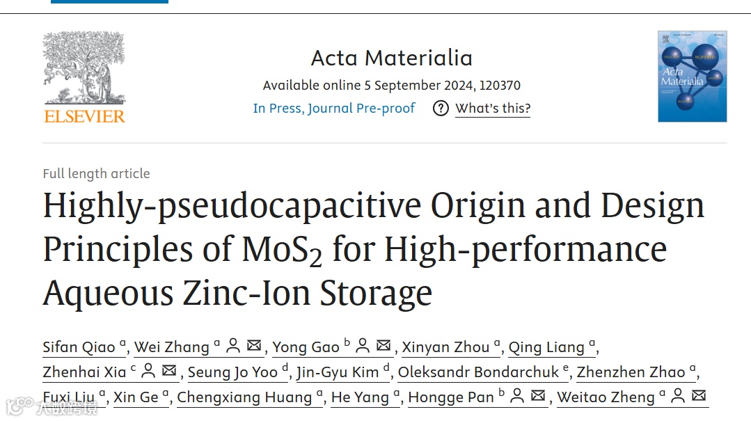 Sifan Qiao, Wei Zhang, Yong Gao, Xinyan Zhou, Qing Liang, Zhenhai Xia, Seung Jo Yoo, Jin-Gyu Kim, Oleksandr Bondarchuk, Zhenzhen Zhao, Fuxi Liu, Xin Ge, Chengxiang Huang, He Yang, Hongge Pan, Weitao Zheng, Highly-pseudocapacitive Origin and Design Principles of MoS2 for High-performance Aqueous Zinc-Ion Storage, Acta Materialia, 2024, 120370.