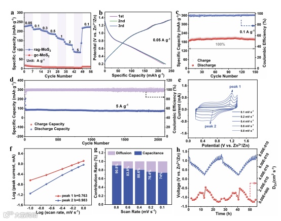 为了探究获得的高赝电容rag-MoS2电极材料的锌离子存储可行性,组装了Zn-MoS2纽扣电池,利用金属锌作为负极,三氟甲烷磺酸锌作为水溶液,进行储锌性能测试,如图5所示。当电流密度在0.05 A g−1时,电池的放电容量达到232.59 mAhg−1,而结晶度良好的MoS2在0.1 A g-1时,放电比容量仅达到~5 mAhg-1,这与Zn2+的溶剂化结构有关,可以合理地认为晶相完整的MoS2与[Zn(H2O)6]2+之间存在强烈的静电斥力。而rag- MoS2打破了给定晶格间距的限制,增加了吸附位的数量,提供了额外的赝电容存储贡献。此外,也展现了比较优异的循环稳定性, 0.05 A g−1时,可以稳定循环150次以上,打破了低电流密度下活性物质溶解的缺陷。在5 A g-1电流密度下,2100次循环后其容量保持率为83.8%。