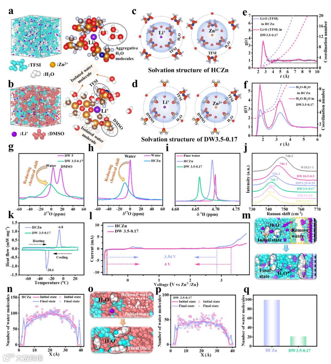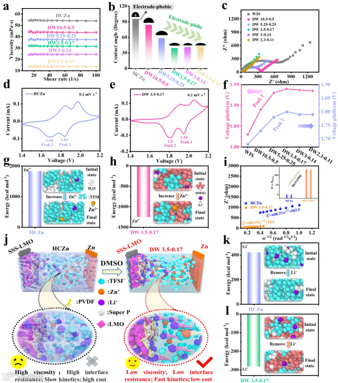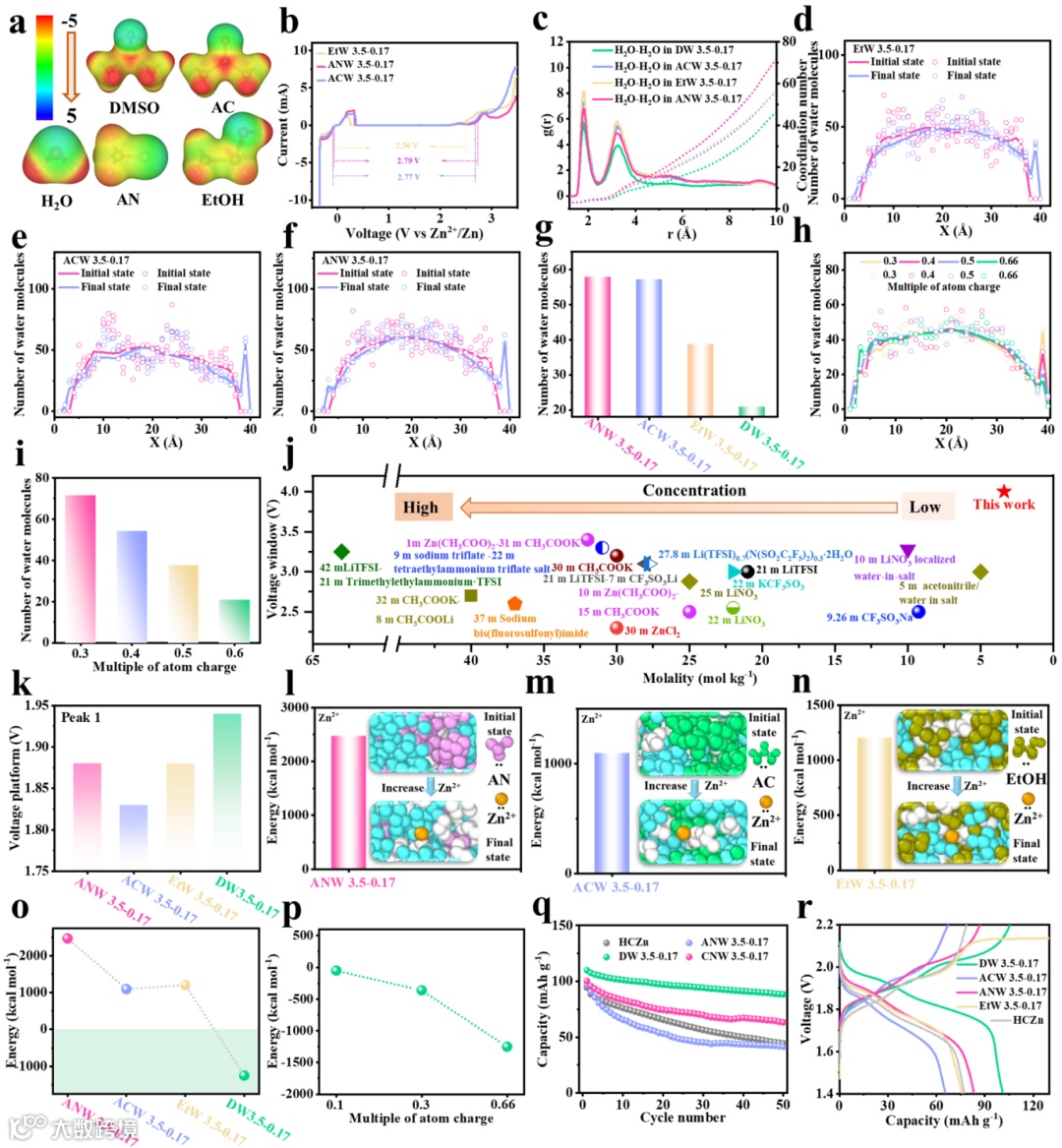 当前水系锌基电池由于其高理论容量、低成本、高安全性而受到广泛关注。然而,受限于传统水系电解质在高电压条件下较差的电化学稳定性,基于常规水系电解质的电池显示出窄电压窗口和低放电电压平台,导致低能量密度。为了解决这个问题,高浓度盐由于其宽的电化学窗口一度被认为是有前途的候选。不幸的是,这些最先进的电解质并没有有效地改善锌基电池的电压平台。锌基电池的工作电压和放电平台较低的问题也导致水系锌基电池无法与锂电池竞争。同时,高浓度也增加了电解质的粘度,阻碍了离子传输,并显著提高了成本。为了克服这些问题,我们介绍了一种新的策略,即溶剂极性诱导阳离子溶剂化鞘调控策略来构筑最大放电平台可以达到1.94 V的高压锌基电池。具体如下:1. 我们利用二甲基亚砜的强极性来调节阳离子溶剂化鞘结构,制备了一种低浓度和高电压的混合电解质。在这个过程中,阳离子溶剂化结构从H2O-M-TFSI到H2O-M-DMSO (M代表锂或锌离子,TFSI:双三氟甲烷磺酰基酰亚胺负离子)。这种转变导致混合电解液体系中水分子活性显著降低。这主要可以归因于DMSO和水分子之间的强氢键以及阳离子和水分子之间的强配位。