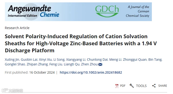 Xuting Jin, Guobin Lai, Xinyi Xiu, Li Song,* Xiangyang Li, Chunlong Dai, Meng Li, Zhonggui Quan, Bin Tang, Gonglei Shao, Zhipan Zhang, Feng Liu,* Liangti Qu,* Zhen Zhou* Solvent Polarity-Induced Regulation of Cation Solvation Sheaths for High-Voltage Zinc-Based Batteries with a 1.94 V Discharge Platform. Angewandte Chemie International Edition, 2024, e202418682
