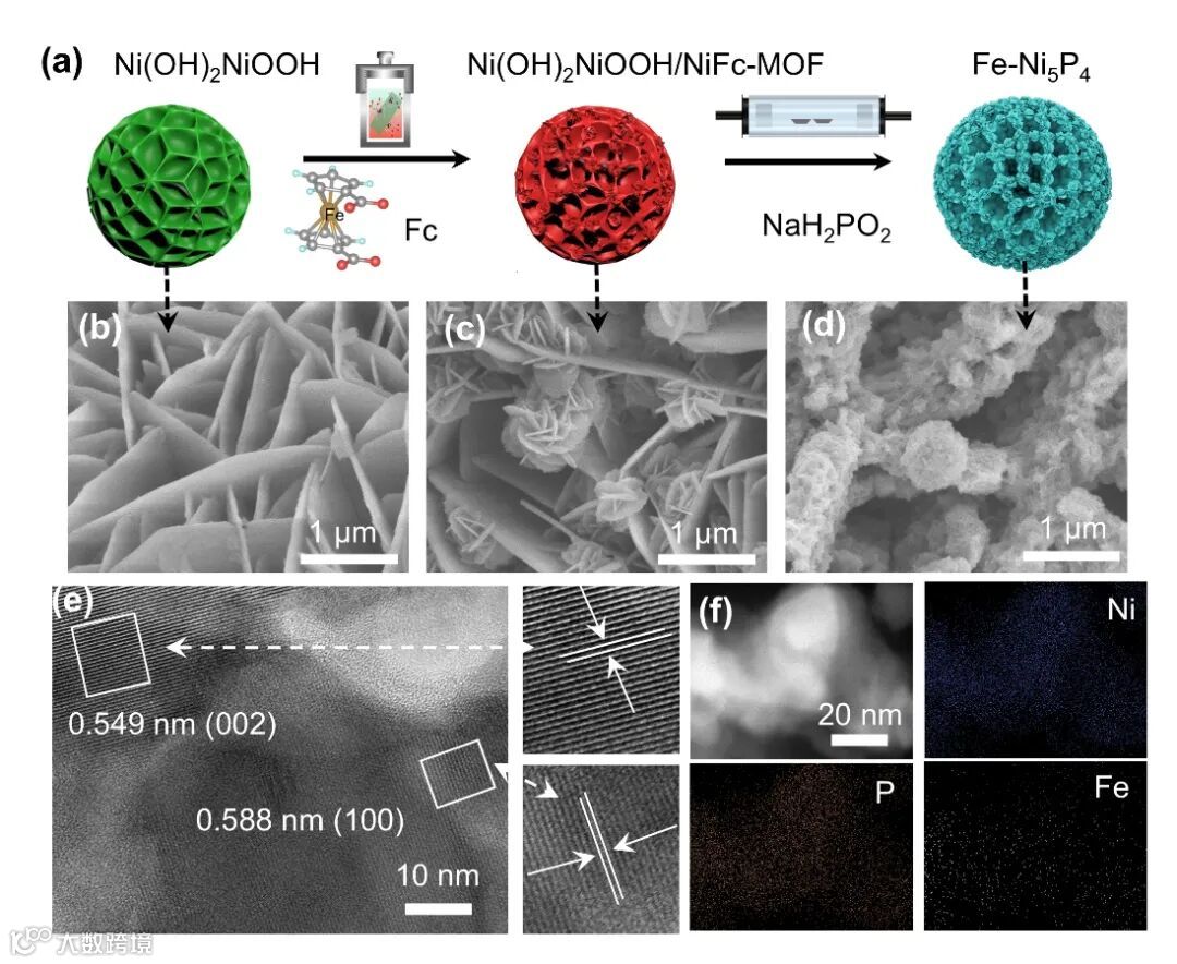 图2. Fe-Ni5P4的制备及其形貌表征。