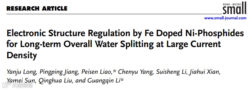 近日,来自中山大学的李光琴教授团队,在国际知名期刊Small上发表题为“Electronic Structure Regulation by Fe doped Ni-Phosphides for Long-term Overall Water Splitting at Large Current Density”的文章。他们通过配位聚合物衍生,获得了高密度分散Fe掺杂Ni5P4材料(Fe-Ni5P4),实验结合理论计算表明Fe掺杂对Ni5P4的电子调控降低了电解水过程的活化能,并有效抑制了海水中氯离子腐蚀,因而在碱性水溶液和碱性海水中表现出优异全解水性能。