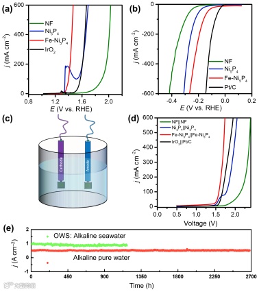 在1.0 M KOH溶液中,在500 mA cm−2的大电流密度下,Fe-Ni5P4的OER过电位仅为230 mV,优于商业的IrO2;HER过电位仅为250 mV。鉴于Fe-Ni5P4优异的OER和HER活性,将其同时作为阴阳两极组装成全解水装置。Fe-Ni5P4||Fe-Ni5P4达到500 mA cm−2的大电流密度仅需要1.72 V的电池电压,可以保持运行2700 h超高的稳定性。即便在碱性海水中也可以在1000 mA cm−2的大电流密度下可以稳定电解1170 h。