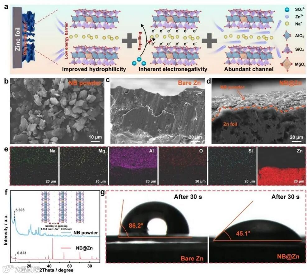 本文利用膨润土材料构建了NB@Zn电极,通过界面工程重构了电解质/负极界面,其离子传输行为示意图如1(a)所示,膨润土人工界面保护层可以作为离子筛,筛分通过的锌离子以及硫酸根离子。SEM图像表明NB@Zn电极表面覆盖有均匀且致密的NB保护层,可以有效避免锌箔负极与电解液的直接接触,从而减少副反应的发生。从亲水性测试实验结果可知,保护层增强了NB@Zn电极表面的润湿性,缩短了Zn2+的迁移路径,减小了Zn2+的转移能垒。