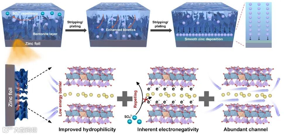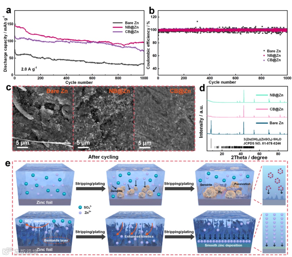 水系锌离子电池(AZIBs)因其环保、经济、高安全性和高比容量等优点而备受关注。然而,锌金属负极存在的腐蚀、析氢等不良副反应和锌枝晶生长,严重阻碍了AZIBs的实际应用。钠基/钙基膨润土(NB/CB)这类粘土材料具有二维层状结构、离子筛分效应等多种优势,是一种性能优异的人工界面保护层材料。以NB为负极的界面层,其层状结构可为Zn2+的迁移提供快速通道;其带有负电荷的特性可防止电解液中活性水分子和SO42-与锌负极接触,从而有效减少副反应的发生;此外,也因其带负电荷的特性,使得优化后的锌负极对阳离子更具吸引力,有利于锌离子快速的嵌入/脱出。因此,以膨润土材料作为负极人工界面保护层具有极大的研究潜力。