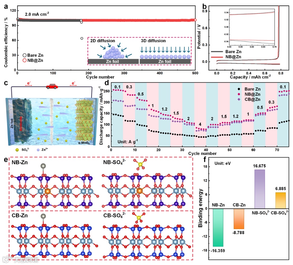 由Zn//Cu和CB@Zn//Cu不对称电池进行CE测试分析可以知,具有NB保护层的锌负极可以进行稳定的电镀/剥离,表现出良好的可逆性。全电池倍率性能测试结果证实了,膨润土作为保护层可有效改善全电池循环过程Zn2+电镀/剥离的可逆性,表现出优异的倍率性能。DFT计算结果显示,膨润土保护层对Zn2+有很高的结合能,证明它们的存在增强了锌负极对Zn2+的吸引力。此外,膨润土与SO42-的结合能为正值,表示膨润土将排斥SO42-的通过。这一结果可以进一步证明膨润土保护层不仅有效地促进Zn2+的转移,还可减少SO42-对锌负极的影响,体现膨润土保护层的离子筛分作用。