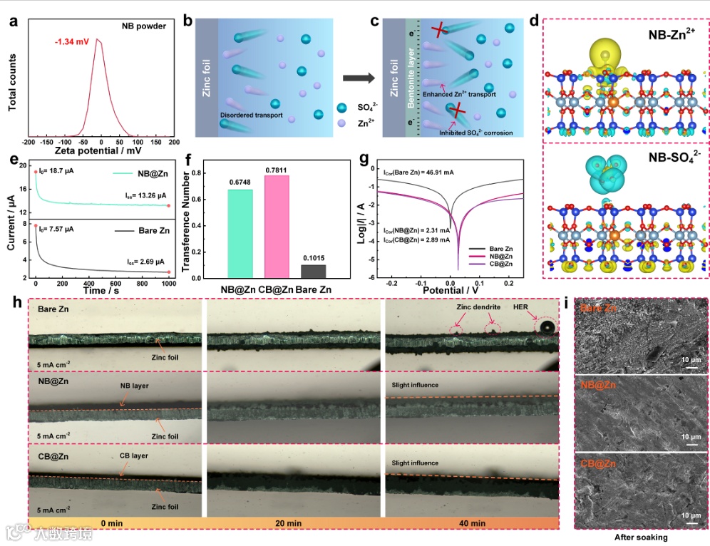 通过Zeta电位测试和差分电荷密度图,进一步证明了带有电负性的膨润土保护层可以实现的离子筛分作用。由锌离子迁移数的计算结果可知,膨润土保护层独特的层状结构为Zn2+向提供快速通道,大幅提高锌离子转移率。通过线性极化测试,表明在循环过程中膨润土保护层有效抑制了腐蚀和析氢反应的发生。从CA测试结果可以看出,NB@Zn电极会促进Zn2+快速进入三维扩散,减少锌枝晶的生成,膨润土保护层可以有效调节Zn2+沉积过程。原位光学显微镜和SEM图像进一步说明了膨润土保护层的离子筛分作用减少了水系电解液对锌箔的侵蚀作用。