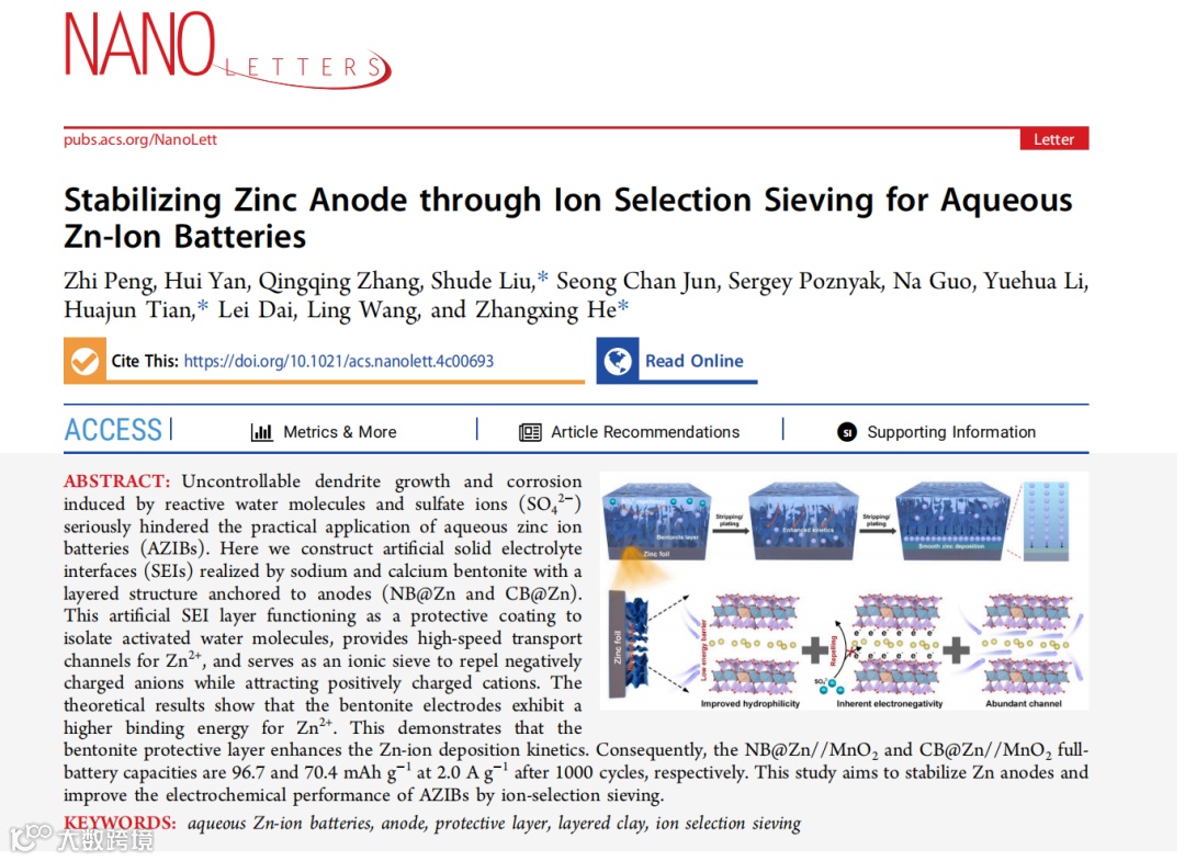 Zhi Peng, Hui Yan, Qingqing Zhang, Shude Liu,* Seong Chan Jun, Sergey Poznyak, Na Guo, Yuehua Li, Huajun Tian,* Lei Dai, Ling Wang, and Zhangxing He*, Stabilizing Zinc Anode through Ion Selection Sieving for Aqueous Zn-Ion Batteries, Nano Lett, 2024.