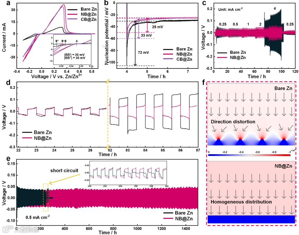 通过Zn/Ti半电池的CV测试可以看出,膨润土保护层减小了电位差,有效降低了锌离子的沉积屏障。从成核过电位测试结果可以看出,NB@Zn表现出了最低的过电位,证明膨润土降低了锌成核势垒,有利于促进Zn2+的快速成核。由对称电池倍率测试结果可知,随着电流密度增加,裸锌对称电池在高电流密度下出严重的的极化现象,电压分布不稳定;相比之下,NB@Zn对称电池的充放电曲线相对稳定,并表现出良好的倍率性能。膨润土保护层还可以调节负极表面电场分布,减少浓差极化现象的发生。采用膨润土改性电极组装的对称电池,在长期循环过程中表现出快速的离子传输性能,以及稳定的电压平台和优异的可逆性。