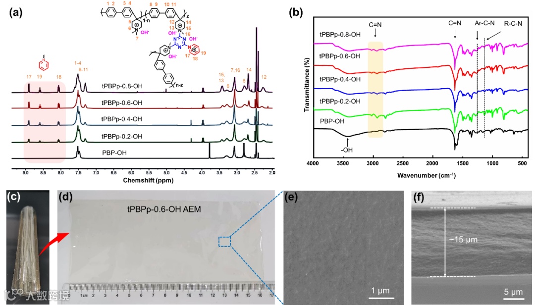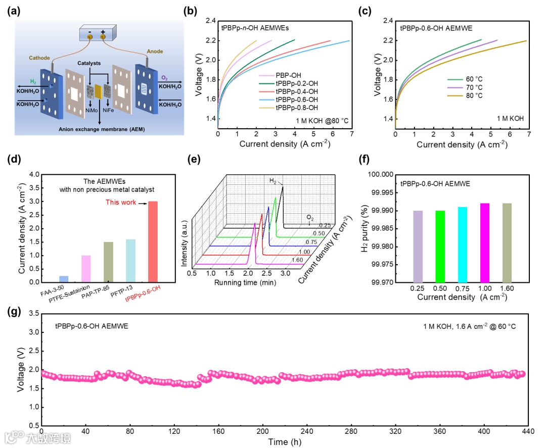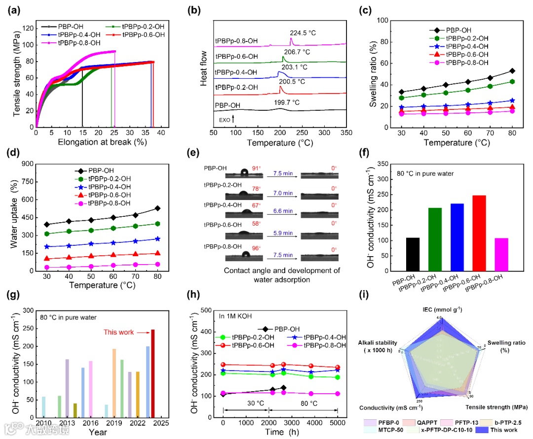 在这项工作中,作者将三嗪交联与吡啶封端(tPBPp-OH)相结合,开发出了一种具有 PBP 网络的坚固AEM,用于先进的水电解应用。(图1a)。与上述交联基团(TPM、TPB 和 TPC)相比,含有丰富氮原子的三嗪不仅能提高 AEM 的亲水性,还能通过三聚氯氰与 PBP 中的氨基反应引入阳离子基团。此外,在交联位点上的吡啶封端还能防止形成致密的网络,提高 AEM 的离子交换能力。另外,三嗪的交联能有效抑制 PBP 的溶胀。因此,所得到的tPBPp-0.6-OH AEM具有低溶胀率(19.2%)、优异的机械强度(79.4 MPa)和高氢氧根离子电导率(247.2 mS cm-1),优于当前报道的最先进的AEM。此外,该tPBPp-0.6-OH AEM在1 M KOH 中的稳定性可长达5,000 小时。更重要的是,在商用镍铁和镍钼催化剂的条件下,基于tPBPp-OH AEM的电解槽在2 V电压下的电流密度可达 3 A cm-2,超过了大多数已报道的AEM。