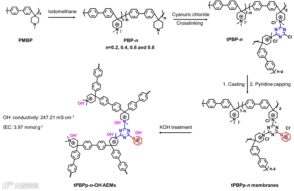 理想的 AEM不仅应具有较高的氢氧化物传导性,还应具有良好的运行稳定性。AEM通常由含有阳离子基团和 OH- 的聚合物组成。AEM的两个主要功能是传导OH-和隔离膜两侧的气体,这直接影响到电解槽的效率和制氢的纯度。从理论上讲,提高 AEM 电流密度的关键在于提高理论 OH- 交换容量(IEC)。目前,线性无醚聚(芳基哌啶)已被证明是一种优良的耐碱 AEM 材料。其中,聚联苯吡啶(PBP)具有超高的理论IEC(3.55 mmol g-1),但由于其膨胀率较高,尚未直接用作AEM。近年来,一些研究人员利用三苯基甲烷(TPM)、三苯基苯(TPB)和三碟烯(TPC)交联 PBP,以优化其结构稳定性,并取得了重大进展。例如,TPC 交联的 PBP 可用作 AEMWE 的离聚物,并表现出优异的性能。因此,克服 PBP 的溶胀问题并提高其离子传导性对于真正长期使用基于 PBP 的 AEM 具有重要意义。然而,传统的交联方法虽然能解决溶胀问题,但也容易形成更致密的网络,从而牺牲离子导电性。因此,要获得既具有高 OH- 导电性又具有高结构稳定性的高性能 AEM 仍具有挑战性。