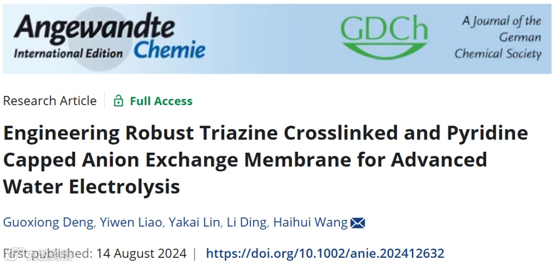近日,来自清华大学的王海辉教授和丁力助理研究员团队在Angewandte Chemie International Edition上报道了题为“Engineering Robust Triazine Crosslinked and Pyridine Capped Anion Exchange Membrane for Advanced Water Electrolysis”的文章。该工作通过三嗪交联形成刚性网络,并采用吡啶封端以调控网络密度,构建了高离子电导率和高尺寸稳定性的AEM,并应用于非贵金属电解槽高效制氢(图 1a)。