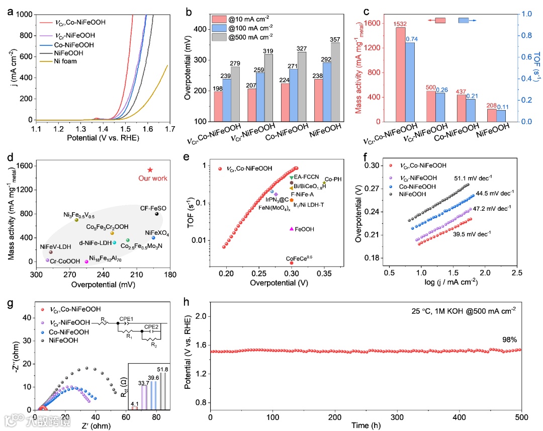 在1M KOH电解液中,VCr,Co−NiFeOOH仅需198 mV的过电位即可达到10 mA cm−2的电流密度,远低于对照样品。在100 mA cm−2时,VCr,Co−NiFeOOH的过电位比NiFeOOH降低了18.1 %。在过电位为300 mV时,VCr,Co−NiFeOOH的质量活性是NiFeOOH的7.4倍,表明Co掺杂和Cr空位的协同作用显著提升NiFeOOH的OER活性,尤其是在高电流密度条件下。此外,在过电位为300 mV时,VCr,Co−NiFeOOH的TOF为0.74 s−1,分别是单掺杂样品VCr−NiFeOOH和Co−NiFeOOH的2.85和3.52倍,是NiFeOOH的6.73倍,进一步表明Co掺杂和Cr空位的协同调控作用。VCr,Co−NiFeOOH较小的Tafel斜率和电荷转移阻抗也表明Cr空位与Co掺杂有效地加快了NiFeOOH的OER反应动力学。此外,在500 mA cm−2的电流密度下运行500小时后,VCr,Co−NiFeOOH的电压保持率高达98 %。