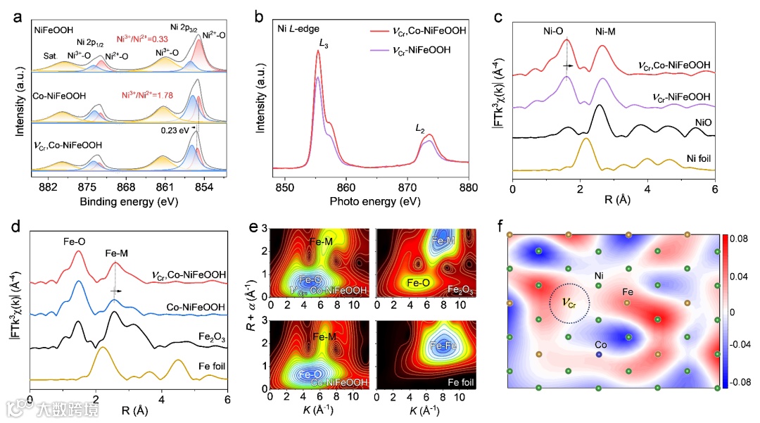 图1. 实验和计算揭示了NiFeOOH中Cr空位和Co掺杂通过调节局部微环境的电荷再分配以协同优化电催化的催化活性。